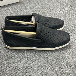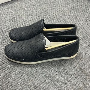 Brand New, stitched leather, holes throughout the exterior design, gum rubber bottoms