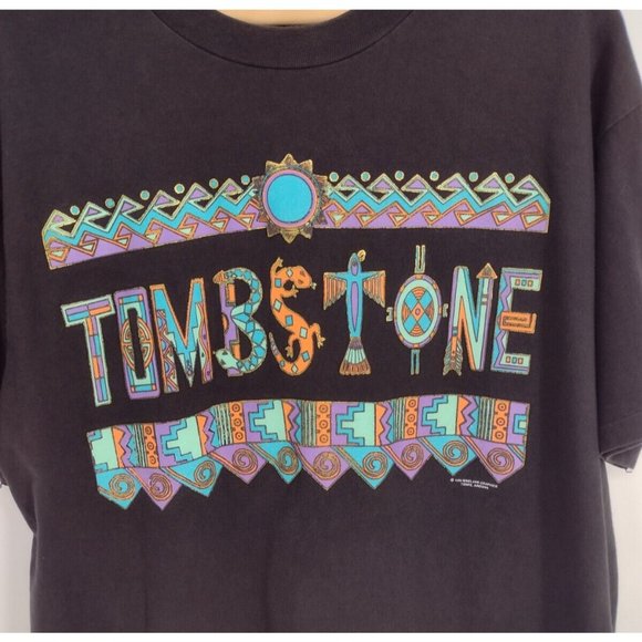 Vintage 90s Tombstone Arizona Aztec Print 1993 Faded Black T-Shirt Mens L