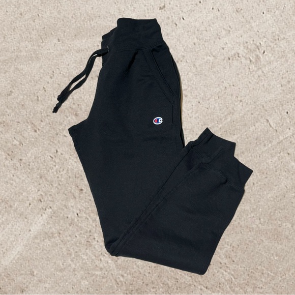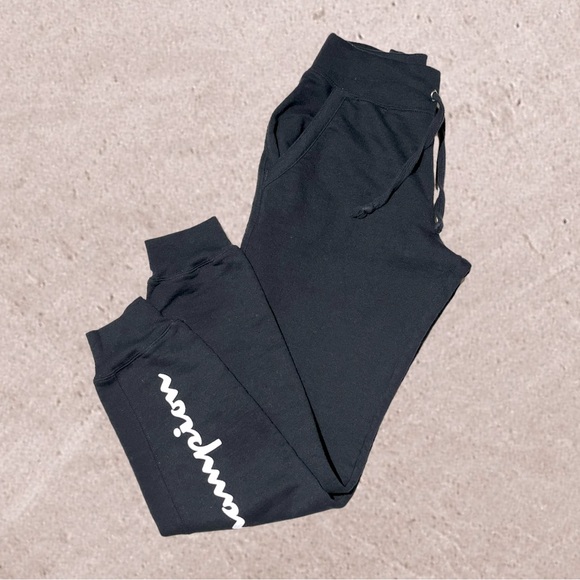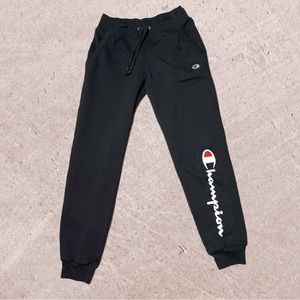 Champion joggers, black with white lettering down the left leg. Elastic waist with drawstring. Excellent preowned condition! Barely worn. See measurements in photos! 😃