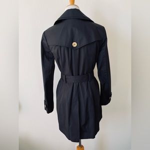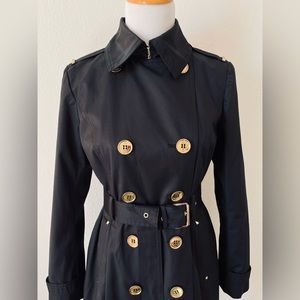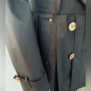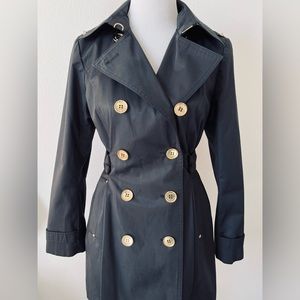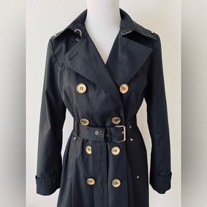 Michael Kors belted trench coat with gold Michael Kors logo buttons. Goes great with any outfit. In EUC. Can fit sizes Small and S/M. Cotton/Polyester blend. Can be tied at back or front for cinched waistline.