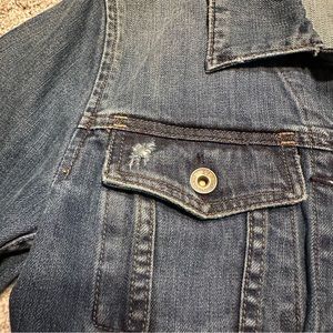 Crop denim jacket with intentional fray style on both chest pockets (both pockets are actual pockets, yay!)