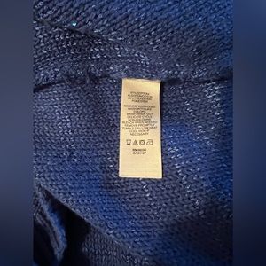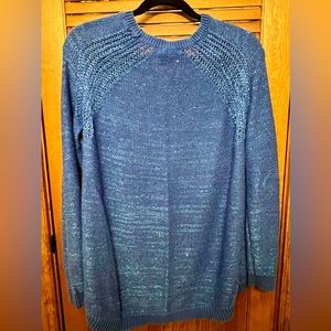 DKNY JEANS. Beautiful sparkly holiday sweater in a royal blue with metallic thread! Size large. Fits loosely. Bust - 21”. Sleeve length 19” (from armpit to wrist). Length: shoulder to hem, 24”on the front; shoulder to hem, 27” on the back. Ribbed cuffs, hem, and neckline. Raglan sleeves.