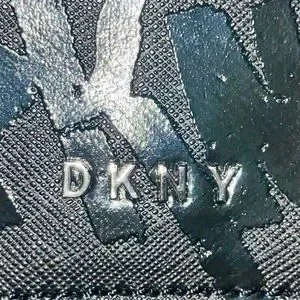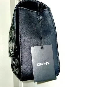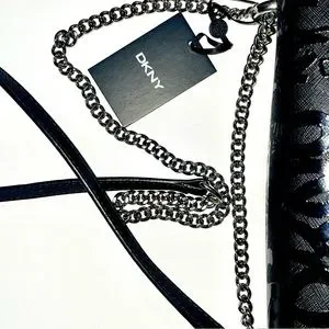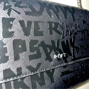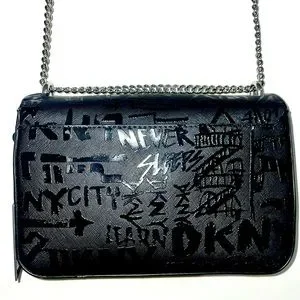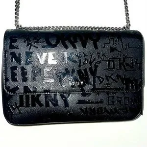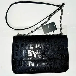 Black faux leather DKNY Sina MD Flap Shoulder Bag Crossbody Handbag with Embossed Logo Graffiti with silver chain strap.