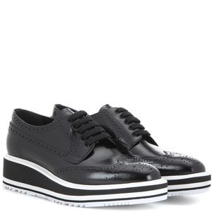 These Prada by Miuccia Prada Platform Derbies feature a glossy brushed leather Brogue styling with thick creeper platforms. The sole is done in a Bicolor black and white thick rubber. Front lace-up closure. Height is approximately 1.75 inches. These are from the Spring/Summer 2011 collection.