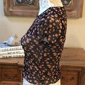 Super cute sheer floral top.... black with pink flowers.... 95% polyester and 5% spandex... stretchy....Size medium