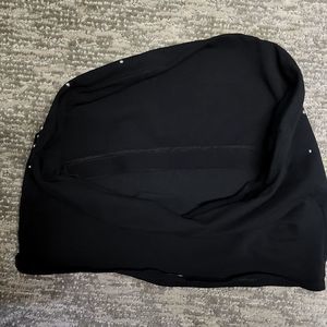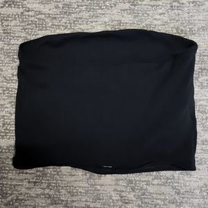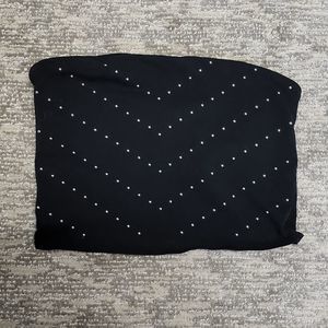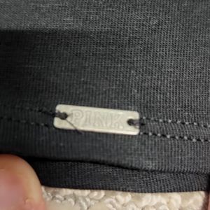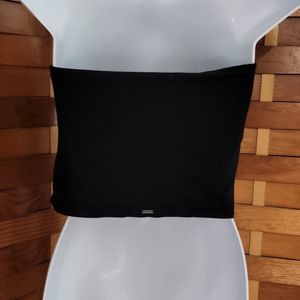 Victoria Secret PINK brand bandeau top in a black cotton/ spandex blend material. Shelf bra with elastic band. Size large. Silver studs across the chest. like new condition. measurements are 15 inches across the chest laying flat from side seam to side seam. and 8 inches in length from top of chest to hem. with stretch. strapless bra style just wider
