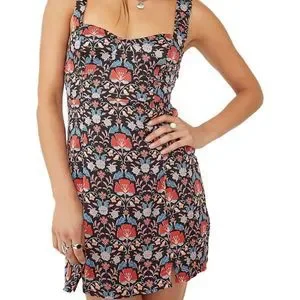 Sweetheart neckline on a short floral dress that is perfect on its own or layered with a jacket