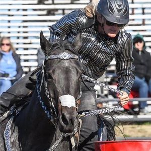 Absolute gorgeous showmanship shirt. This also has been ridden in 1 rodeo class. Super shiny with crystal zipper, texture color all on as black stretchy fabric. Hugs your body for a clean smooth look. Classy style that would go with any color horse. One of s kind!!