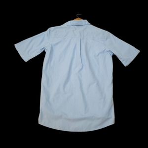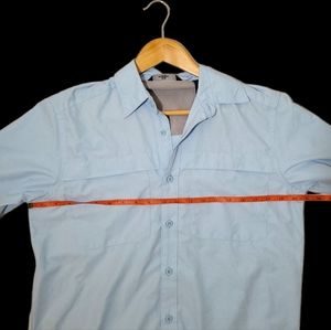 DESIGN: Light blue short sleeve button up collard shirt. 2 front pockets. Gray mesh lining on upper inside.