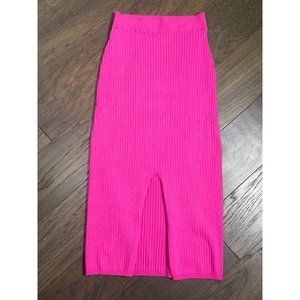 Free People hot pink pencil skirt. Pull on style with wide ribbed waist; front slit; plenty of stretch; meant to fit close to body. Approx 24" waist, 32" from waist to hem; slit approx 11.5" in length.
