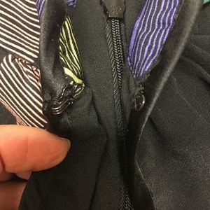 Black with pretty floral print. Halter style neck with a slit keyhole and front hook closure. 2 button closure at the top of the back with a zipper too. Slit on one side. Solid black lining. 100% silk. Lining is polyester. Dry clean. Made in the USA.