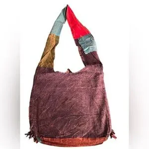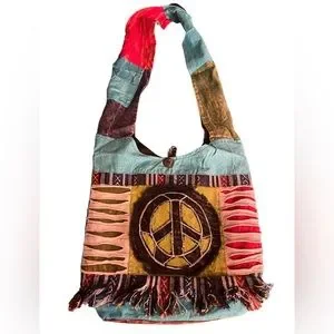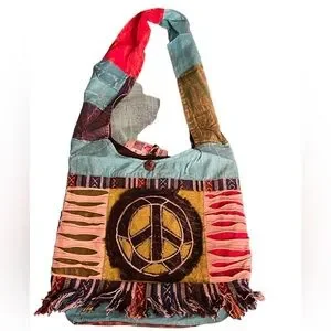 Made in Nepal, durable cotton fabric. Nice deep pocket on the inside that has a zipper. The bag zippers shut at the top as well. Nice pocket that has Velcro is on the handle. The height of bag is 14 1/2 inches. The width of bag is 15 1/2 inches. The handle on bag is 44 inches. Nice crossbody bag. Creative patchwork design.. New with the tags.