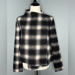 The raw hem of this BB Dakota Quinn jacket gives 90’s grunge vibes. Black/Blue/White plaid pattern. Wear it snapped or open. Size small.