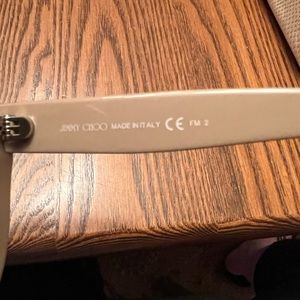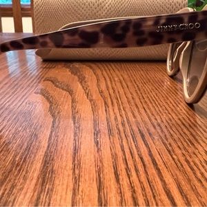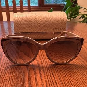 Really cute Jimmy Choo Nicky/S sunglasses. “Semi” cat-eye, full rim. Animal nude with IC gray mirror shaded silver lenses. Plastic acetate. Made in Italy. NWOT. Comes in original case (the back of the case came dented from Bloomingdales with a small pen mark on the inside but it protects the glasses the same).
