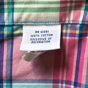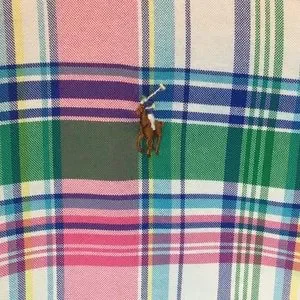 Ralph Lauren long sleeve button down shirt. Beautiful plaid with main colors of pink, blue and green 100% woven cotton. Includes 3 extra buttons. Non-smoking/no pet household.