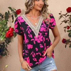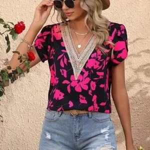 Floral Print Lace Detailed Petal Sleeve Blouse