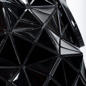 The genius Bao Bao Lucent tote bag in black from Issey Miyake featuring vinyl triangles superimposed over a mesh network that allows the bag to form a myriad of 3D shapes. This spacious bag comes with two vinyl handles, and an interior nylon flat zip pocket.