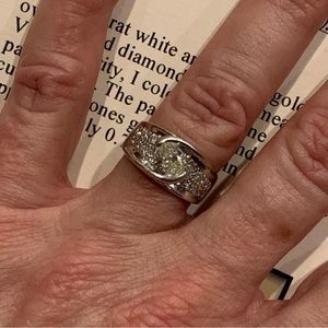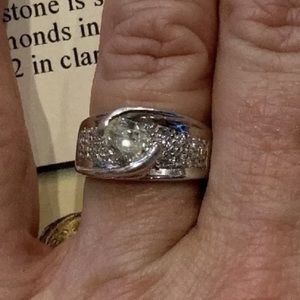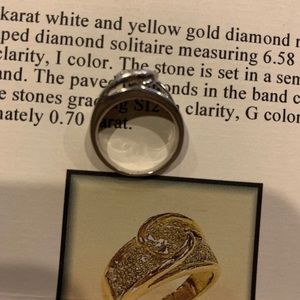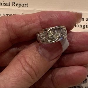 Beautiful floating main diamond atop a beautiful pave band. Since the time of the appraisal I had the ring rhodium plated for a white gold look. I also improved the ring by having a small gold bar added to each side to stabilize the main stone.