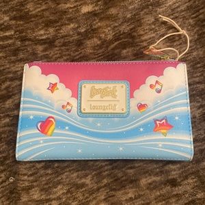 Loungefly Lisa Frank Unicorn Reflection Flap Wallet This pretty wallet showcases Lisa Frank Unicorns, dolphins, a rainbow and clouds! Wallet features: -Sturdy metal hardware -Front of the wallet has a white resin metal label embossed with the classic Lisa Frank logo and Loungefly's script logo -Inside there are 7 card slots, 1 clear ID pocket, 1 slip pocket -Coordinating fabric lining -Measures: 6.5" Wide x 3.75" High