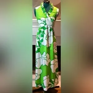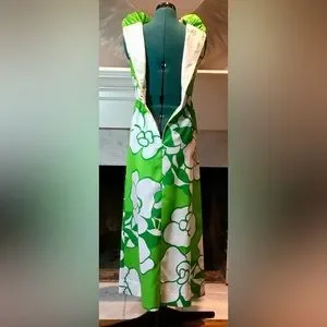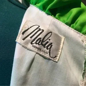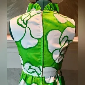 vintage hawaiian dress - size small - 1970s. A fun/festive green and white tropical print with ruffled V-neck. No tears, stains or signs of wear - excellent condition - like new. No size tag or care label -see measurements and I suggest hand wash or dry clean. Great for a theme party, pool party or a cruise vacation.