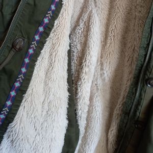 It has a hood that is not detachable with fake fur.