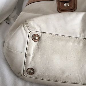 This pre loved large satchel still has plenty of wear left. Five inside pockets, two zippered. Silver accents off white leather bag with tan straps. Bag has some scuffs as shown in pictures.