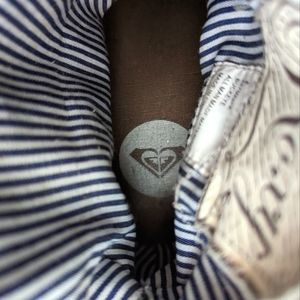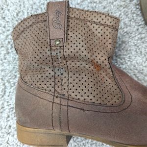 Used buckeye faux leather short cowgirl shoes from Roxy. Manmade leather made to look and feel like suede. Beautiful perforated ankle design with pull loops and embossed brand logo. Lovely stripe pattern lined interior. Roxy brand logo embossed on soles.