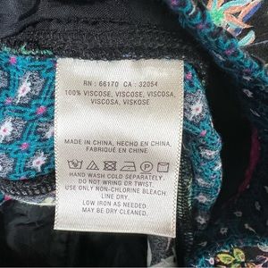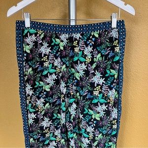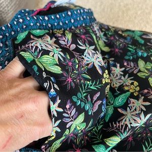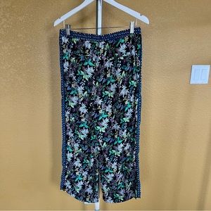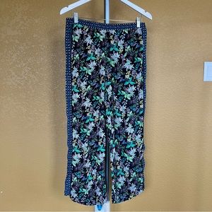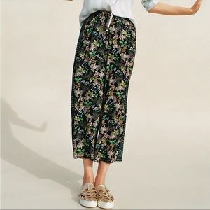 Jewel-toned hues, tropical print, cropped, wide-leg silhouette, Pull-on styling, side pockets, back faux pockets, contrast tint side strips