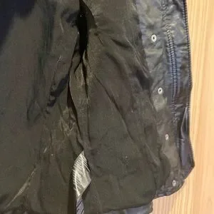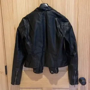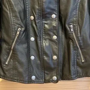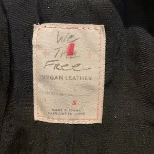 Black vegan leather jacket by Free People/We The Free Brand. Approximately 22” from shoulder to hem. Zipper and snap closures. Appears to be missing a zip-on hood. Machine washable. Excellent used condition!