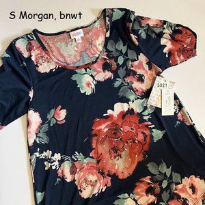Small Morgan tunic top from Lularoe. Navy blue with large red flowers.