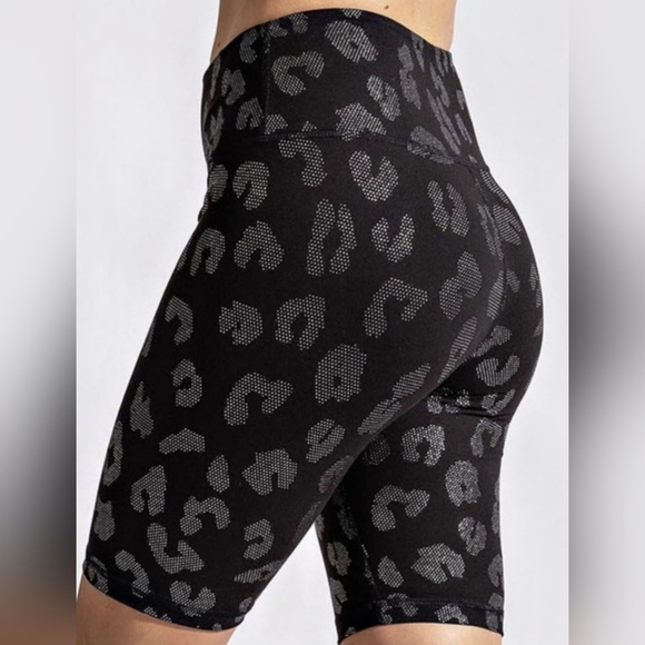 Super soft black high waisted bike shorts with a beautiful shiny silver embossed leopard print.