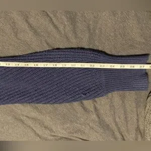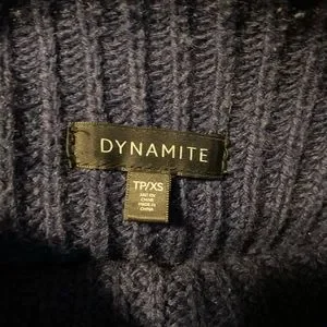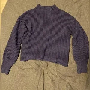Size XS wool blend sweater from dynamite. Soft navy colour, mock neck, dropped shoulders and shorter length (perfect length to tuck the front into high waisted jeans). Please note there is some pilling, most can likely be removed with a shaver. There is a few pulls as well, please see photos!