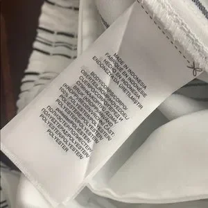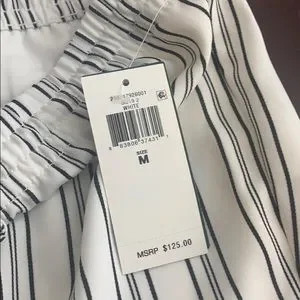 Super cute and airy, polyester pants, elastic drawstring waistband, non functional style pockets to rear, gray and white vertical stripes, straight leg