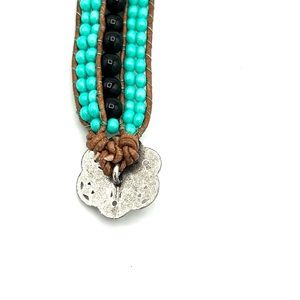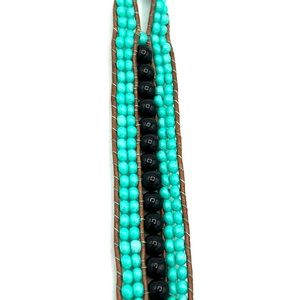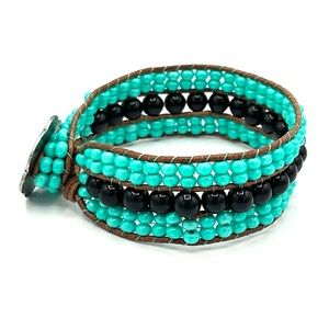 Unique handmade triple cuff bracelet with turquoise colored seed beads and black onyx. Adorned with a floral antiqued silver button closure. Made with brown leather cord.