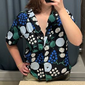 Cropped button down shirt from Uniqlos limited collaboration with marimekko in size Small. Has patterns of different blue and green fruits on it. Has one front pocket and is in good condition. Has a looser cropped fit.