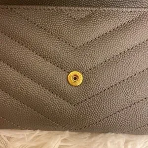 YSL monogram quilted leather wallet in the color Fog with gold hardware.