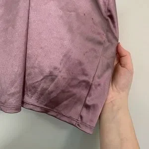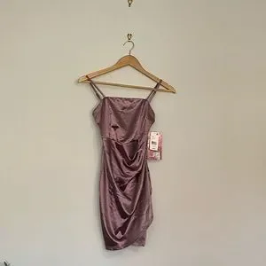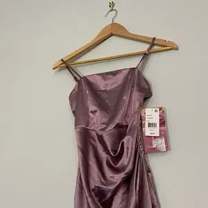 Adjustable spaghetti straps; ruched at side; asymmetric front hem