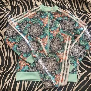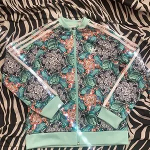 Adidas set the jacket is an small and the leggings are xs. They are 2 different textures. A free gift comes with it