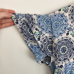 Off white lined wrap dress with blue/green pattern. Wrap effect creates v-neck. Sleeves have a double ruffle.