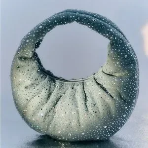 Oval bucket bag. Pleated denim exterior with crystals. Handle. Zip closure.
