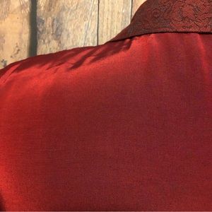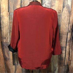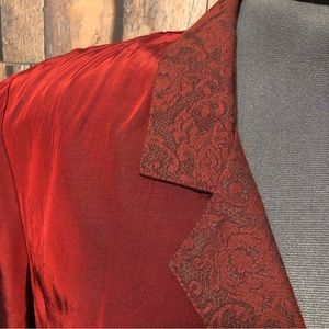Single button front, long sleeves with turn back cuffs. Notched collar & button have coordinating lace print. Cuff lining is solid black. Massive shoulder pads, could be removed. Black camisole NOT included