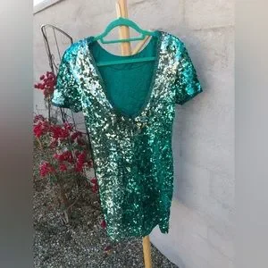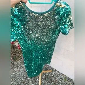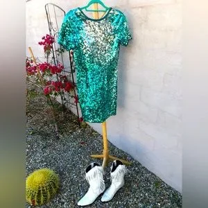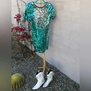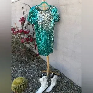 Vintage teal and silver ombré low back cocktail formal dress with short sleeves, vintage size 8, zipper back, beaded neckline and sleeves. Subtle Zipper back. Shoulder pads. Excellent vintage condition. Very carrie underwood vibes. Perfect for Nashville, western, bachelorette dress, prom, homecoming, winter formal.