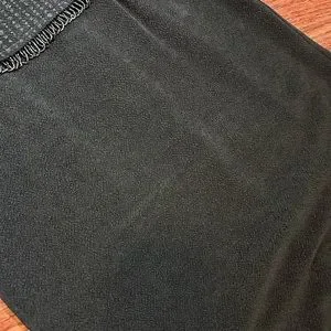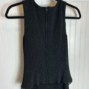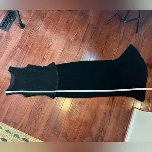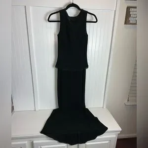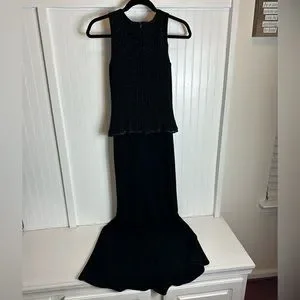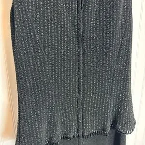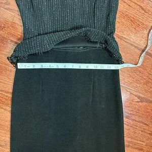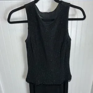 Stylish gown by Scott McClintock. Black with silver sparkles on the top. Top has bead loops along the bottom edge. Zippers down the back. Dress is not a silky material. It is more of a comfort stretch material. Size 4. 92% acetate, 8% spandex. Dry clean. Minor signs of wear as seen in last picture. Overall in good condition.