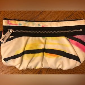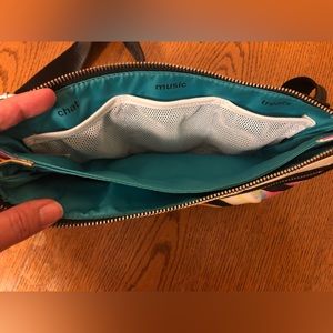 Lululemon Fanny pack. 44 in waist belt. 11 in wide and 6 inches high. 2 zippers, large pocket is split into 2 by fabric. 3 inside mesh pockets. Used, white is no longer bright white but may be brighter after cleaning. See pictures for coloring.
