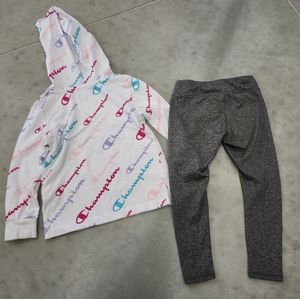 Champion hooded long sleeve and leggings. Shirt has colorful logos all over and does have a couple stains on the front. The leggings have the champion logo on the leg and it has slightly peeled at the waist. Otherwise in great used condition. From a smoke free home.