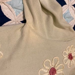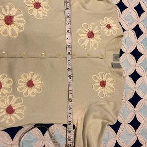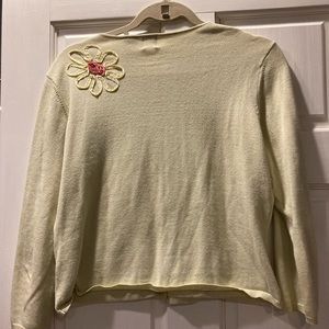 HWR adorable cardigan, appliquéd flowers front & 1 on back. slight discoloration under arms, see pic. 3/4 sleeves. incredibly cute cardigan! good used condition, a chartreuse, yellow color. it is a bit small for a large but that’s what it is marked, see measurements.