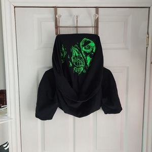 UNISEX Zombie t-shirt, black in color, neon green print reads "Ask me about my pet zombie." Shirt flips (to be worn over your face), revealing zombie face.