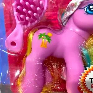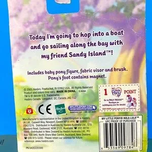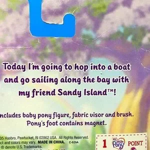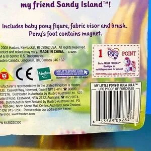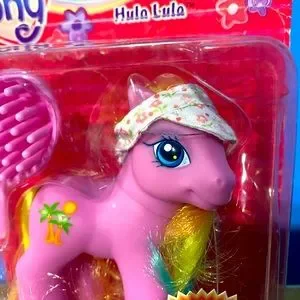 My Little Pony G3 NWT Vintage 2005 Target Exclusive Baby Pony Hula Lula Figure Includes Pink Brush & White w/Pink tiny Flowers Visor, Pony Has Pink/Purple Body, 2 Palm Trees & Sun Symbol, Blue Eyes, Blue/ Orange/ Yellow Hair NEW CONDITION Packaging May have tiny blemishes, Package Size 6.5”x5”x2” Pony Figure Approx 3.5”