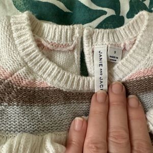 Corduroy wide leg sailor pants with gold buttons with matching striped and ruffled knit sweater.