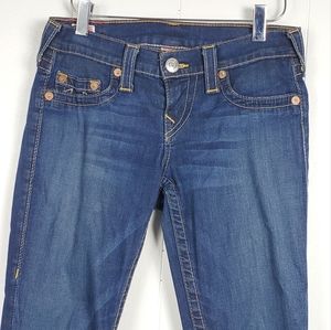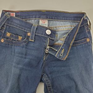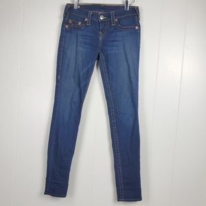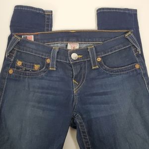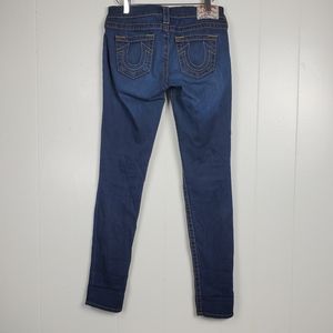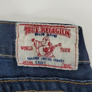 These high-quality jeggings are made by True Religion. They feature Casey jegging style, 2% elastane, 98% cotton, and are size 25. They have approximate measurements laying flat of waist ~ 14.25", hips ~ 20",front rise ~ 7.5", back rise ~ 12.5", inseam ~ 29.5", and cuff~ 5". They have minor wear as pictured. Item # J0002016